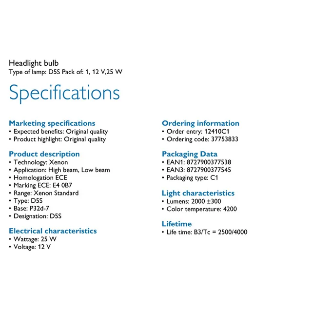 PhilipsOsram AutoLighting Store has All Kinds of Philips Xenon Standard D5S 12410C1 12V 25W Original Xenon HID Headlight Car Bulb Auto Lamp ECE OEM Quality Germany Pack of 1Philips Ultinon LED H7 12V 11972ULX2 6000K Bright Lamps Car LED Headlight Auto HL Beam 160 More Bright GermanyTwin PackPhilips Ultinon LED 9005 9006 HB3 HB4 15W 11005ULX2 6000K Bright White Car LED Headlight Auto. We always advise changing both bulbs at the same time - if one bulb has failed its likely the second bulb will fail shortly after. New generation D5S Xenon HID bulb with 25W power and massive amount of 2000 Lumens.